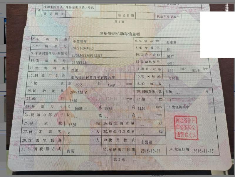 初次登记日期 2016-11-15 车辆名称 起亚牌