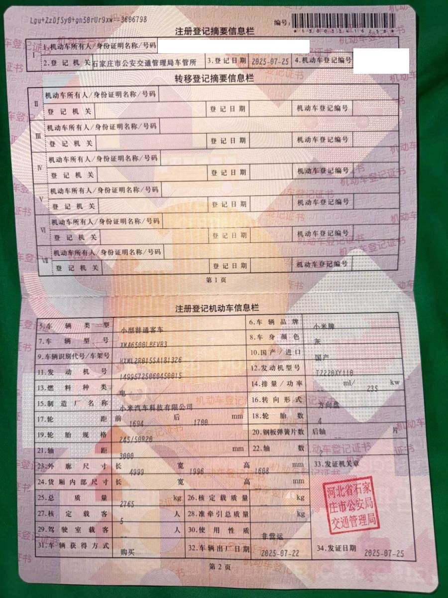 初次登记日期 2025-07-25 车辆名称 小米汽车 小米