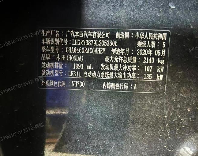 底盘号码 LHGRY3879L2053605 变速箱类型 自动