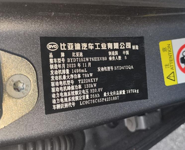 初次登记日期 2023-11-29 车辆名称 比亚迪 秦PLUS