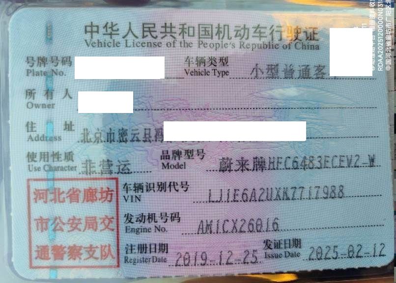 初次登记日期 2019-12-25 车辆名称 蔚来牌