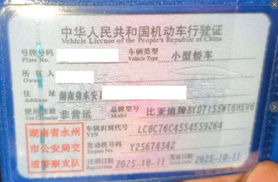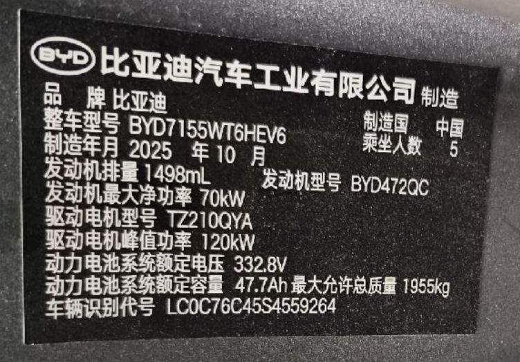 初次登记日期 2025-10-11 车辆名称 比亚迪 秦PLUS