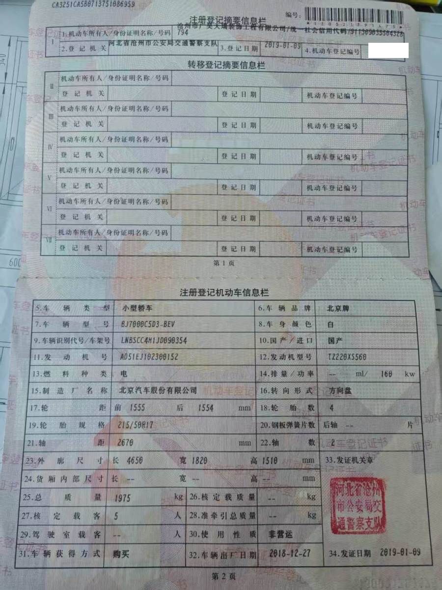 初次登记日期 2019-01-09 车辆名称 北京汽车