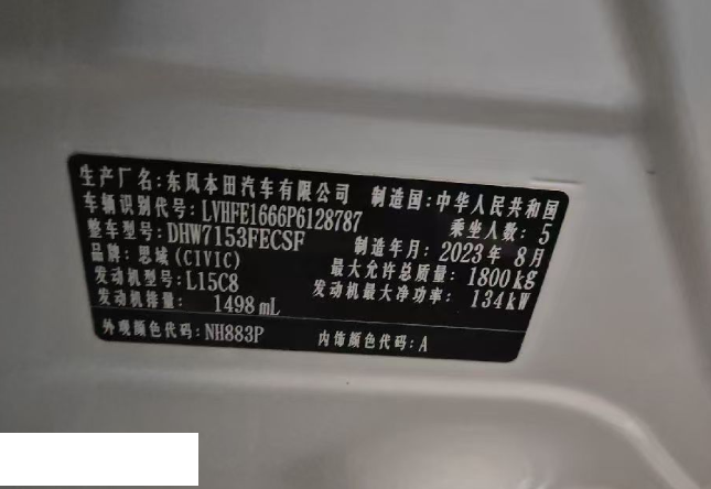 初次登记日期 2023-11-01 车辆名称 本田 思域
