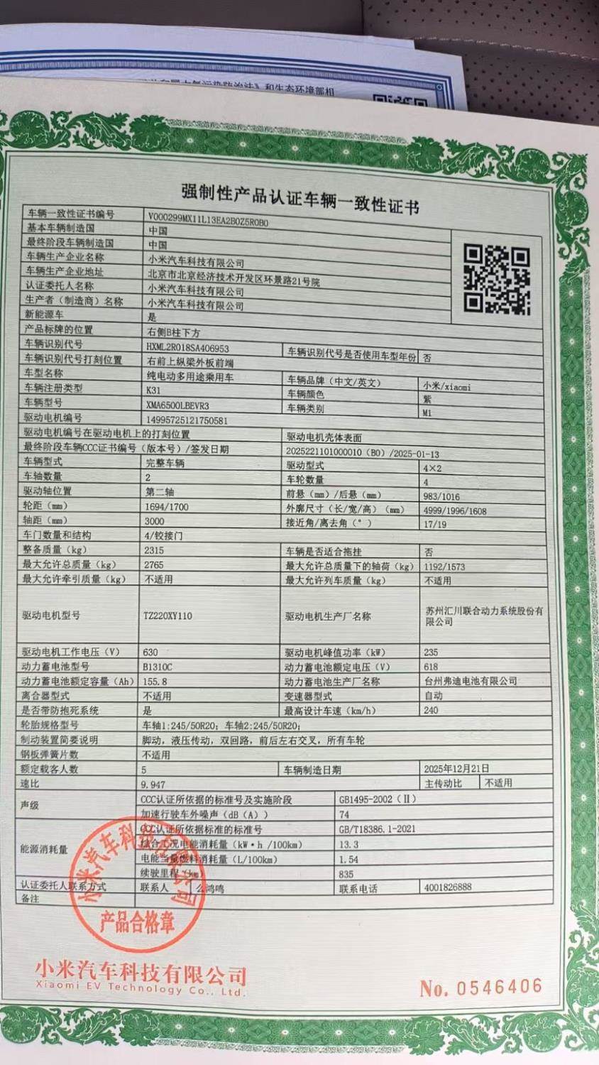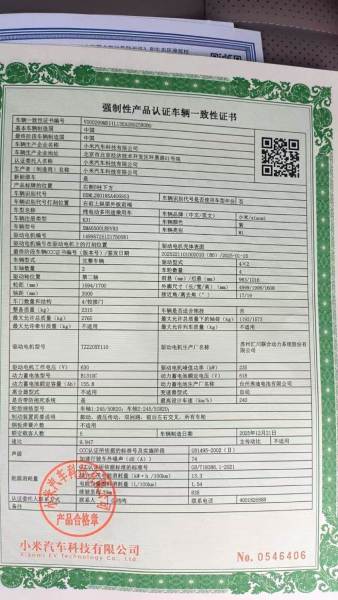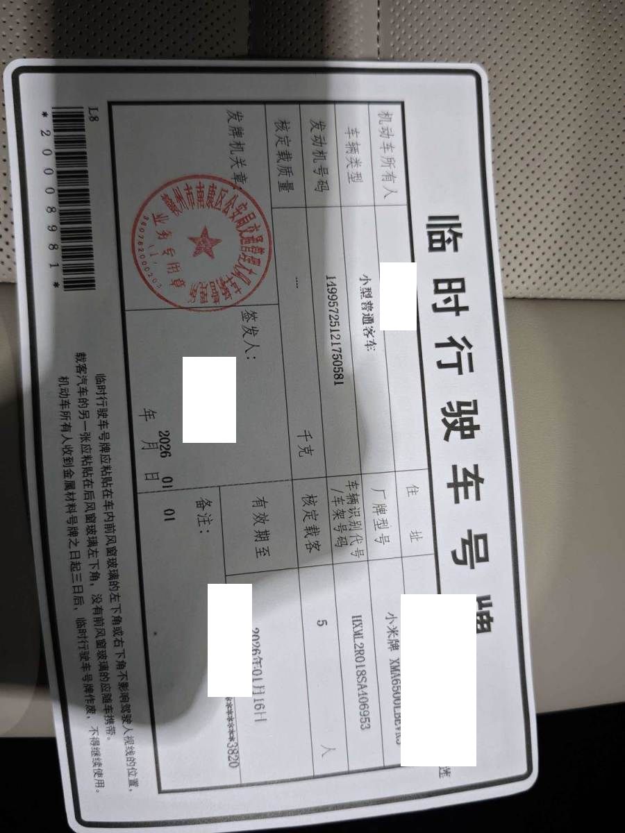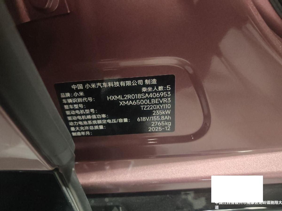 初次登记日期 2025-12-31 车辆名称 小米汽车