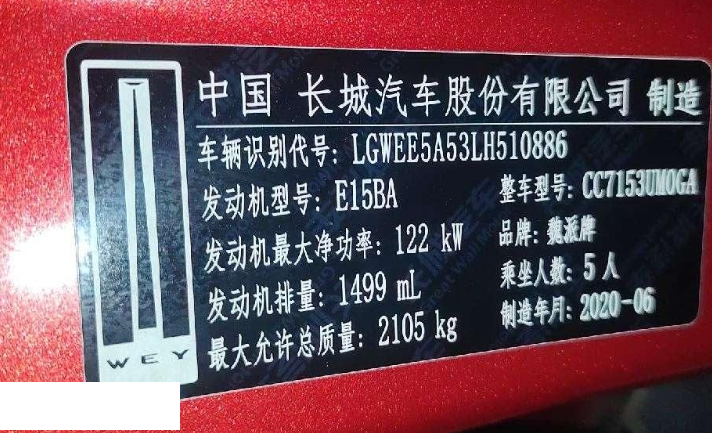 初次登记日期 2020-09-15 车辆名称 魏牌 VV5