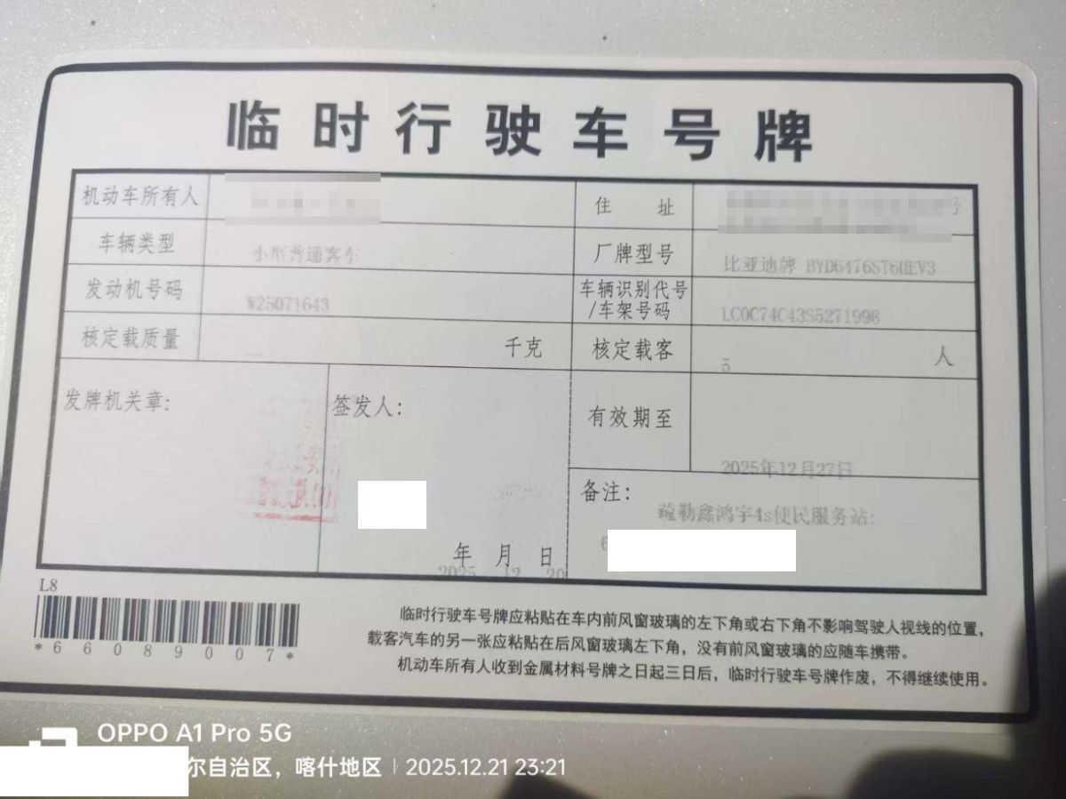 初次登记日期 2025-12-20 车辆名称 比亚迪 宋Pro新能源
