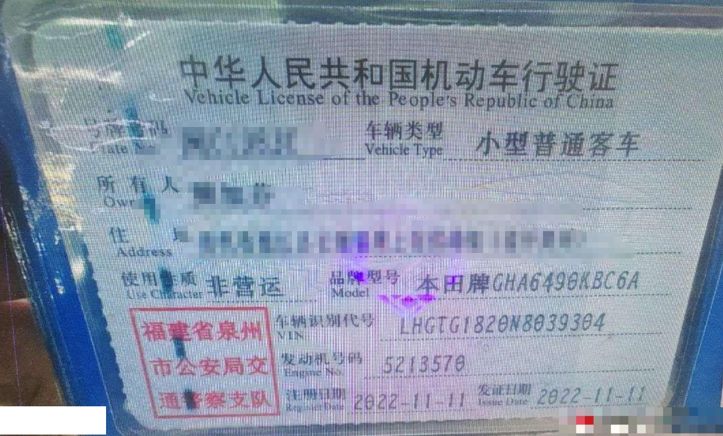 车牌号 闽****** 品牌 本田