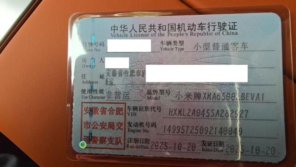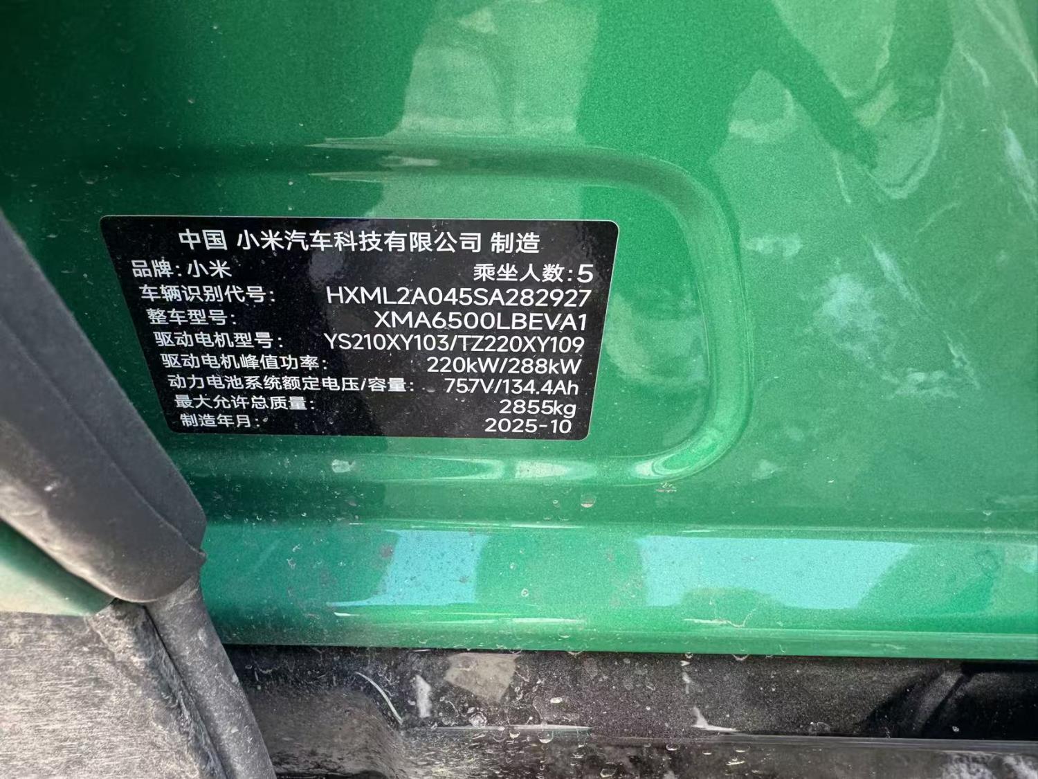 初次登记日期 2025-10-20 车辆名称 小米汽车 小米