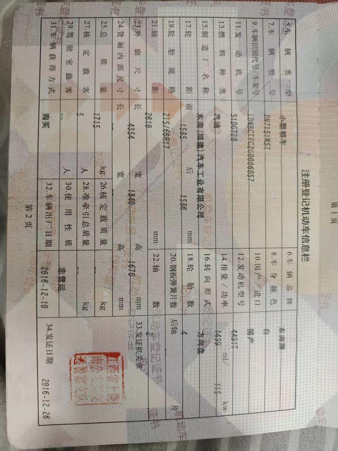 初次登记日期 2016-12-26 车辆名称 东南牌