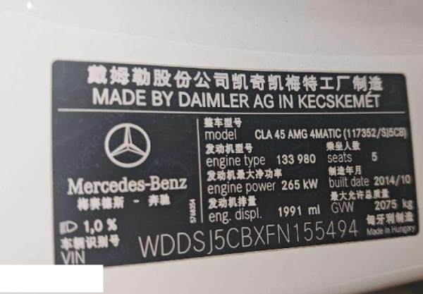 初次登记日期 2015-06-08 车辆名称 奔驰CLA AMG