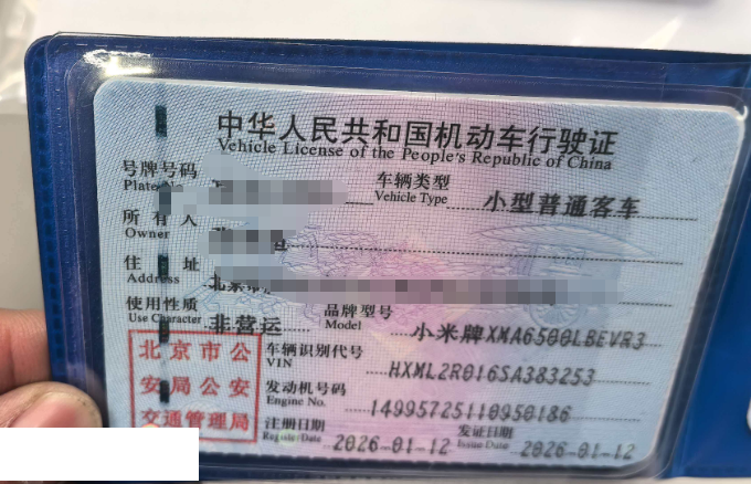初次登记日期 2026-01-12 车辆名称 小米汽车