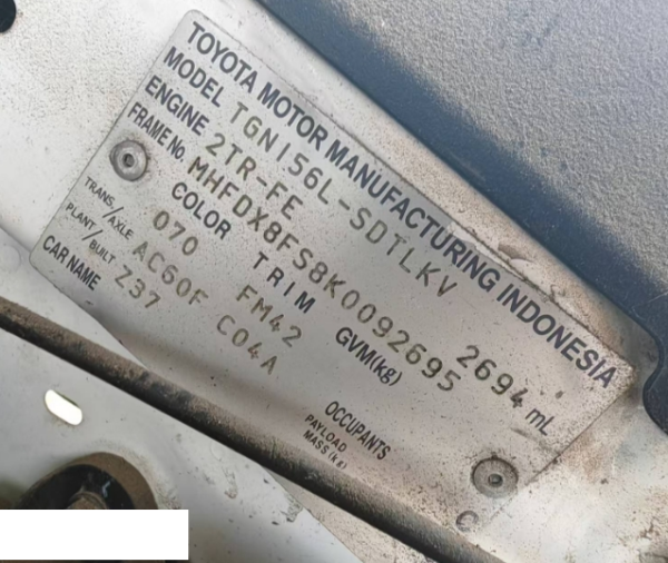初次登记日期 2019-05-13 车辆名称 丰田 Fortuner