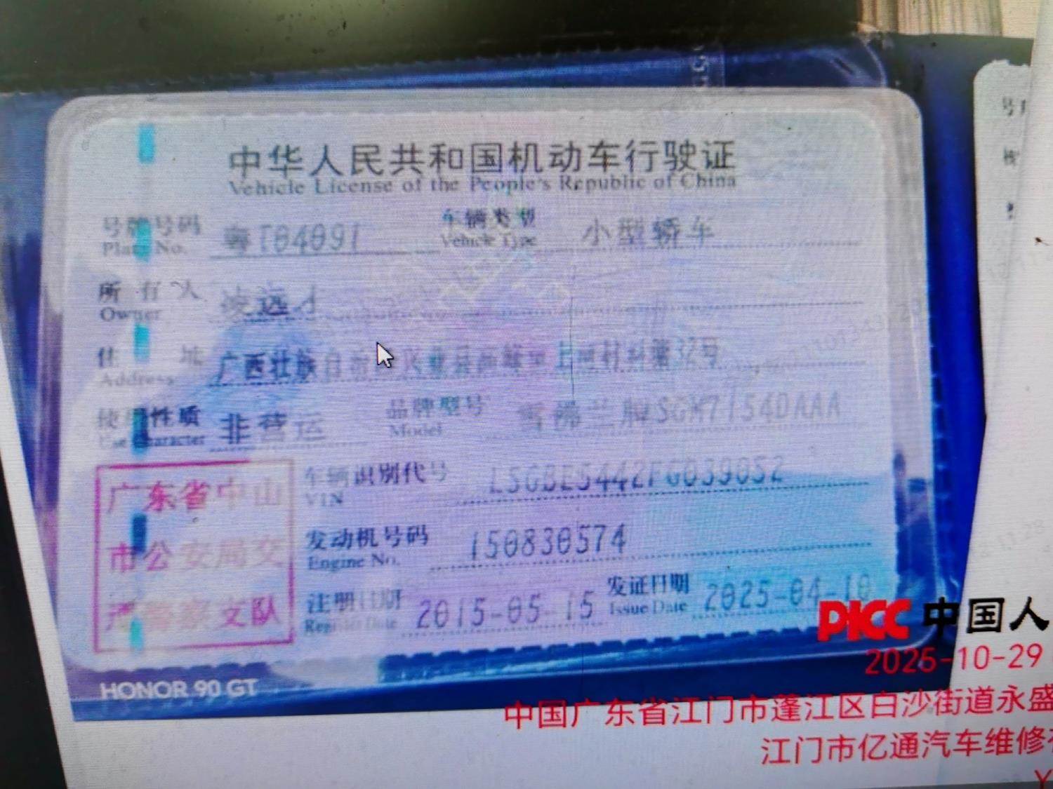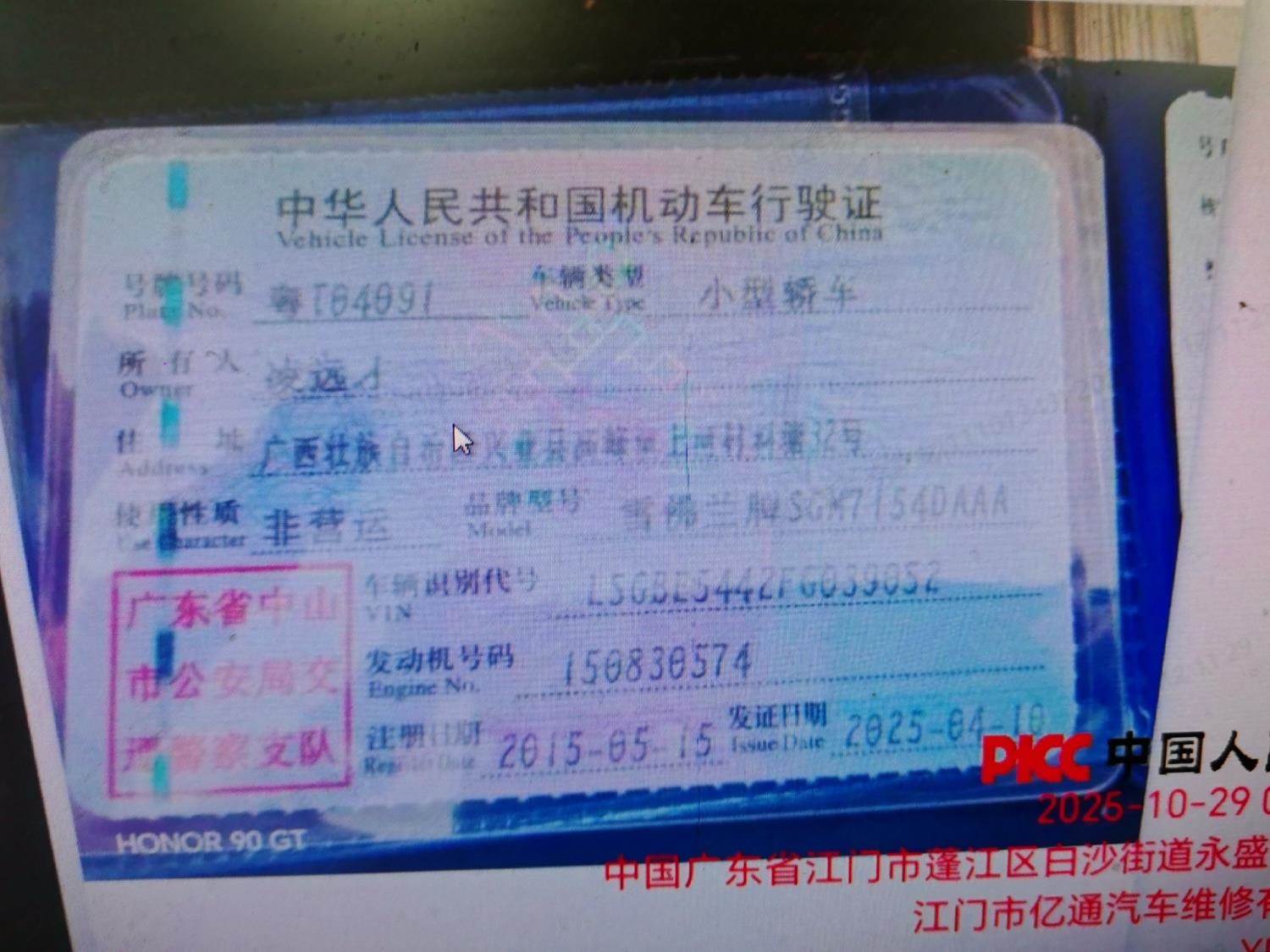 车辆归属地 广东省中山市 车辆停放仓库 广东省江门市江门市