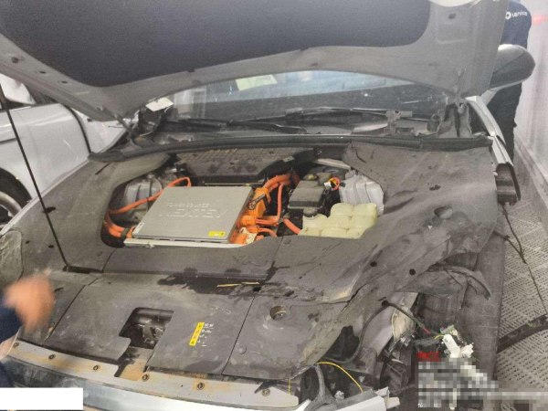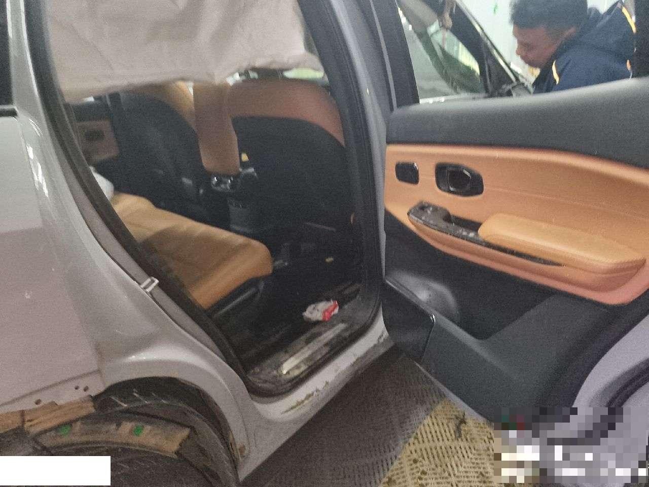 根据所给照片,自行判断钢印号是否受损 碰撞落水车,水淹到座椅,电池已车身分离。手续齐全可正常过户,实地看车出价,电池为购买,底盘受损。请根据现有图片进行估价,如车辆成交后需处置,需3天内完成交款提车,且自行考虑停放期间其他损失。