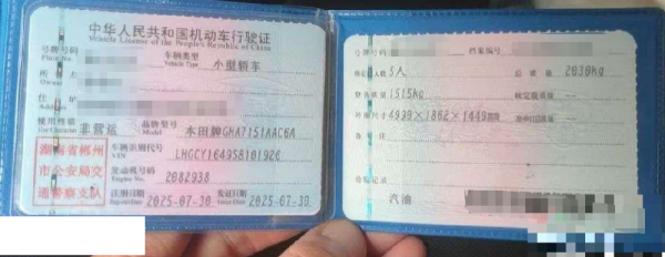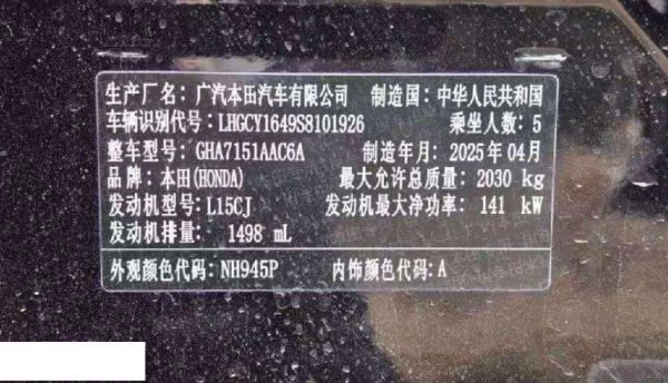 初次登记日期 2025-07-30 车辆名称 本田 雅阁