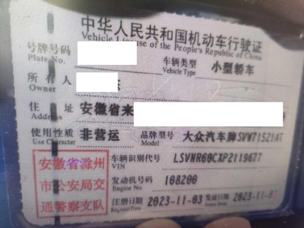 初次登记日期 2023-11-03 车辆名称 大众 朗逸