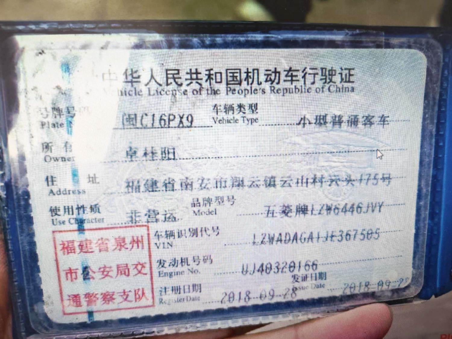 车辆归属地 福建省泉州市 车辆停放仓库 福建省泉州市泉州市
