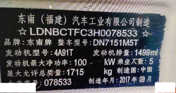 初次登记日期 2017-10-26 车辆名称 东南牌
