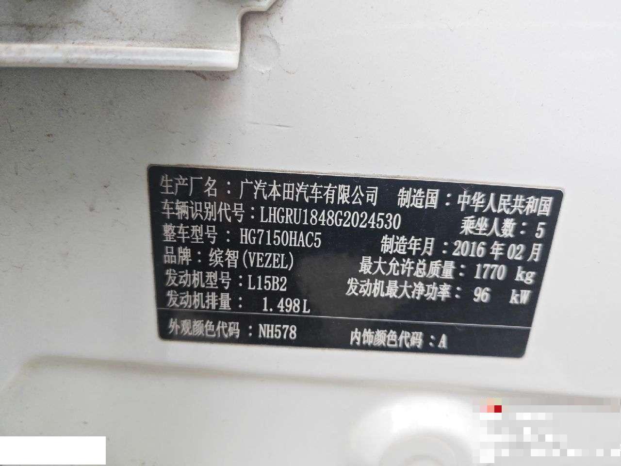 初次登记日期 2016-03-25 车辆名称 本田 缤智