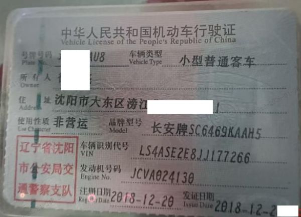 车辆归属地 辽宁沈阳 车辆停放仓库 安徽省蚌埠市