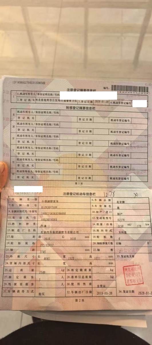 初次登记日期 2020-01-20 车辆名称 北京越野BJ40