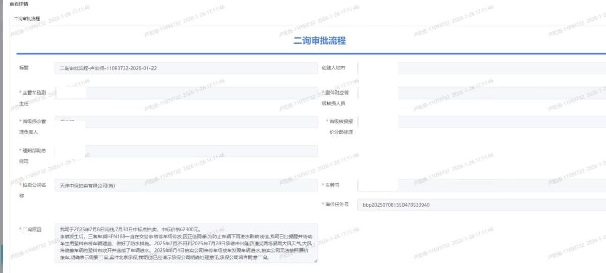 【二询备注:故发生后,三者车一直在交警事故停车场停放,因正值雨季,为防止车辆下雨进水影响残值,我司已经提醒并协助车主用塑料布将车辆遮盖,做好了防水措施。2025年7月25日和2025年7月28日承德市兴隆县遭受两场暴雨大风天气大风将遮盖车辆的塑料布吹开并造成了车辆进水。2025年8月4日拍卖公司来停车场接车发现车辆进水,拍卖公司无法按照原价接车,明确表示需要二询案件北京承保我司也已经请示承保公司明确处理意见,承保公司留言同意二询。】