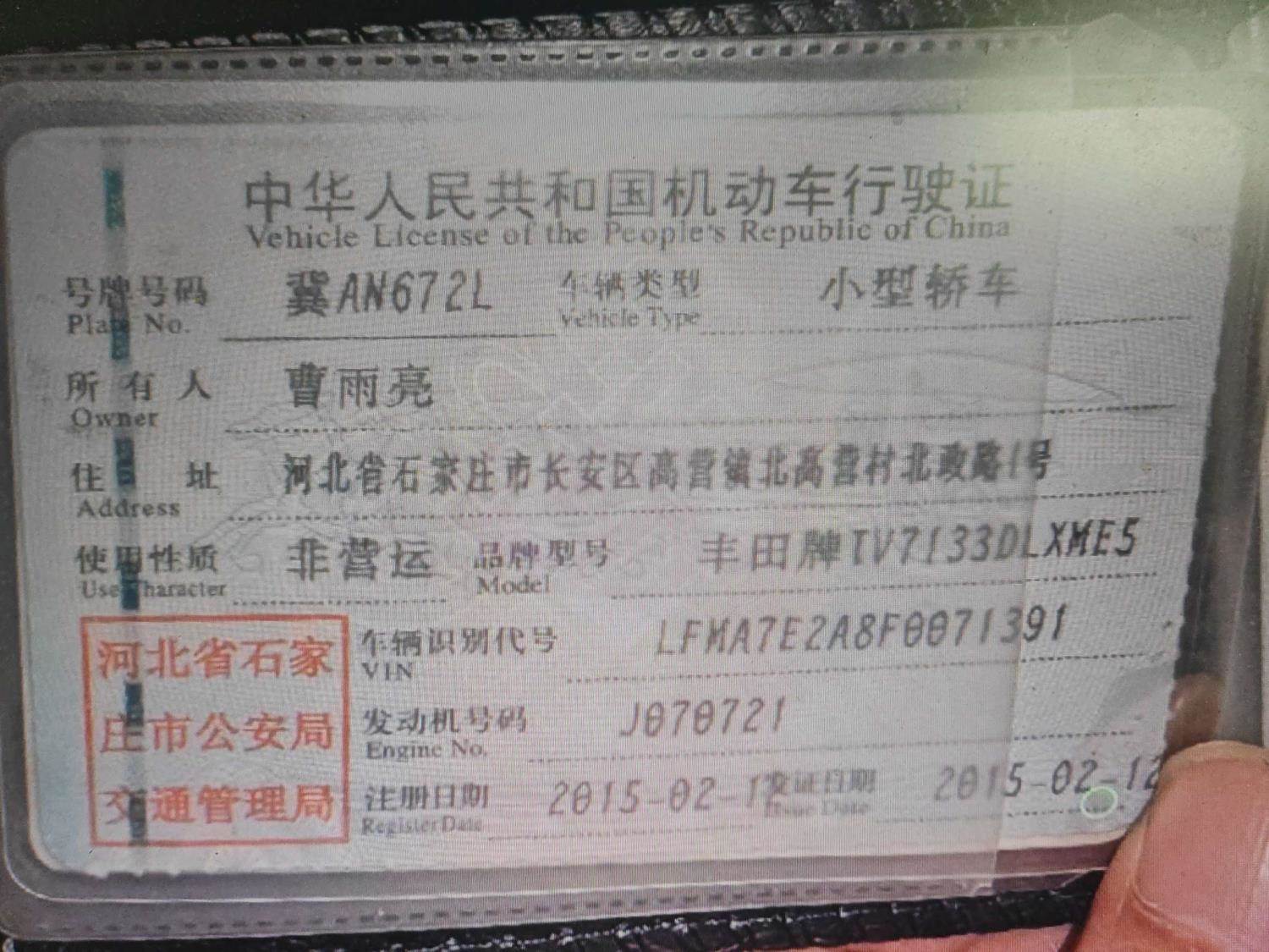 车牌号 冀****** 品牌 丰田