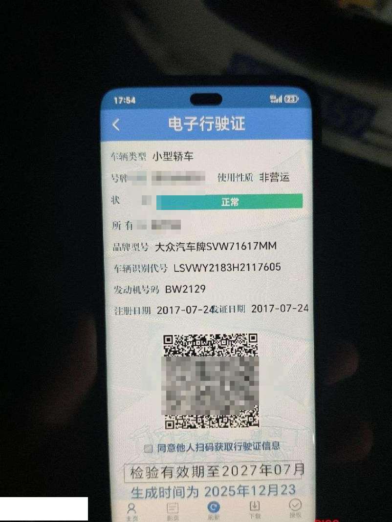 初次登记日期 2017-07-24 车辆名称 大众 朗逸
