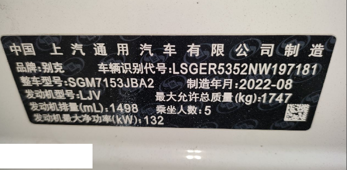 底盘号码 LSGER5352NW197181 变速箱类型 自动