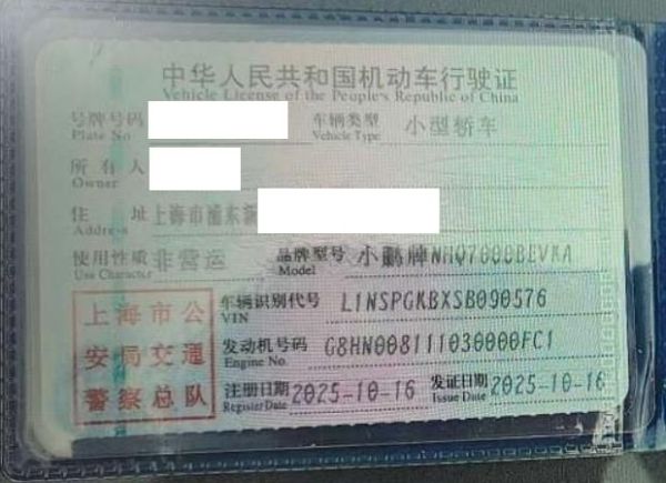 初次登记日期 2025-10-16 车辆名称 小鹏牌
