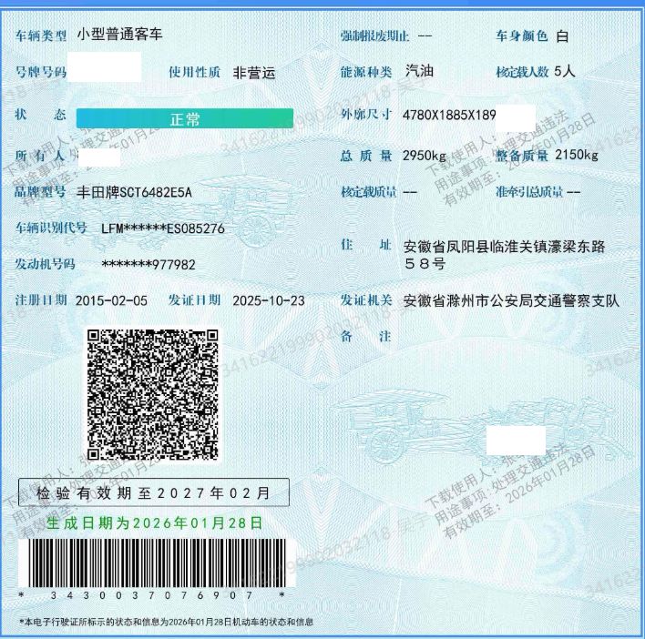 车牌号 皖****** 品牌 丰田
