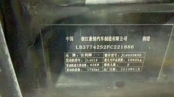 初次登记日期 2015-04-30 车辆名称 吉利汽车 吉利GX7