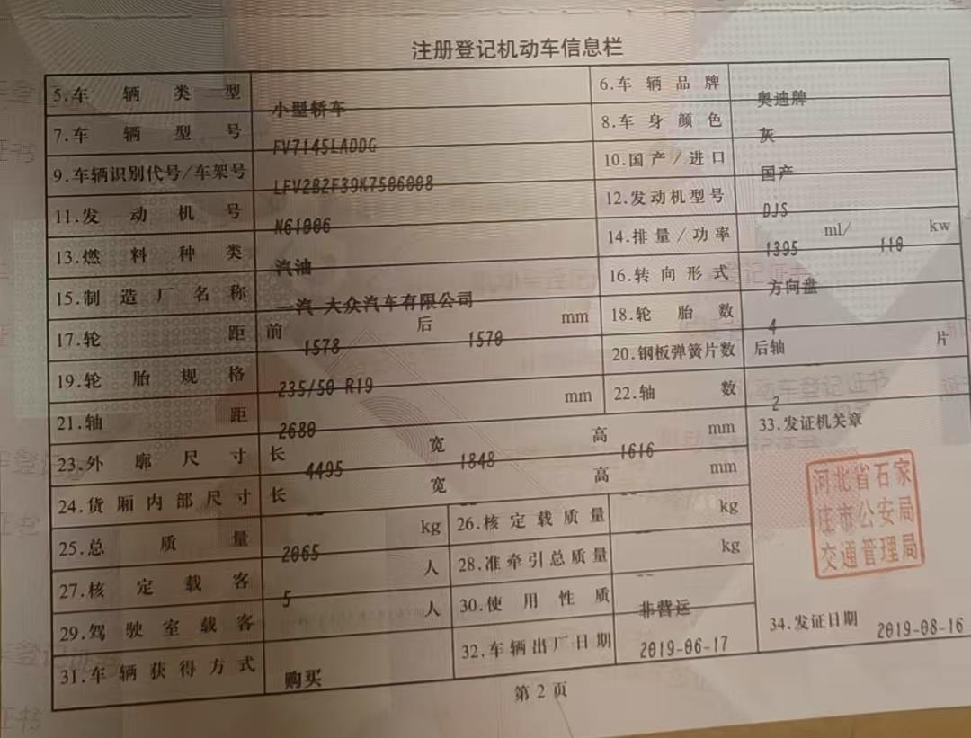 初次登记日期 2019-08-16 车辆名称 奥迪Q3
