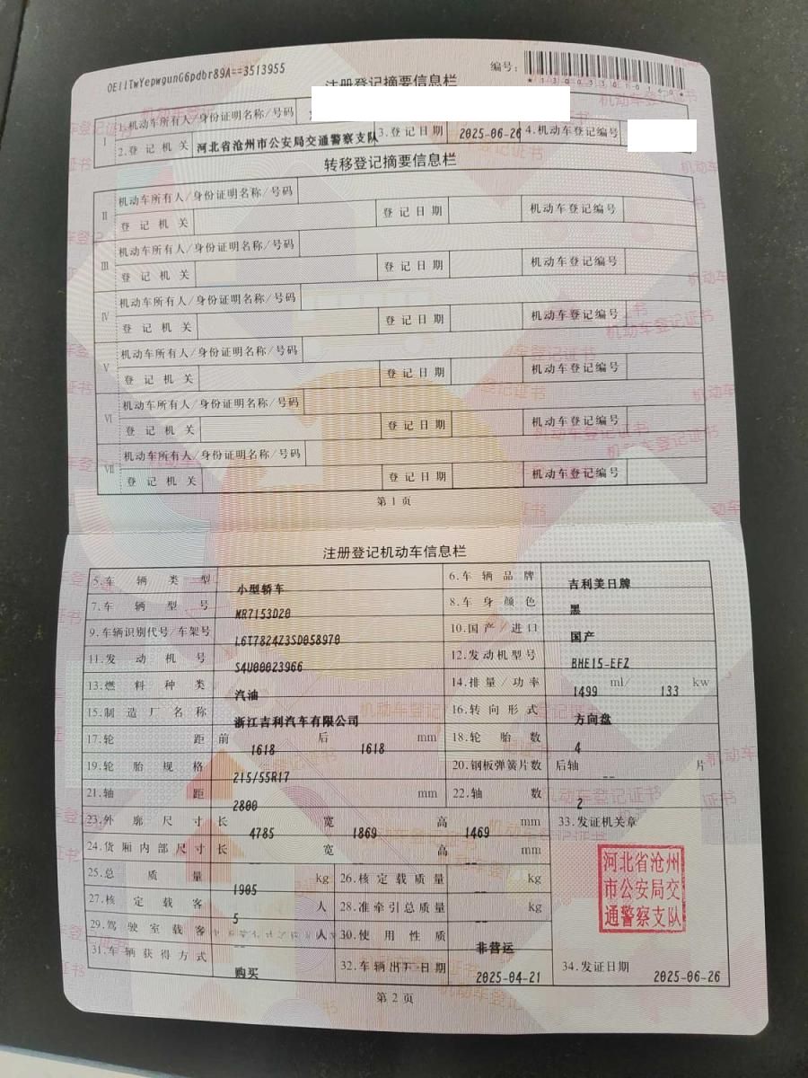 初次登记日期 2025-06-26 车辆名称 吉利汽车 星瑞