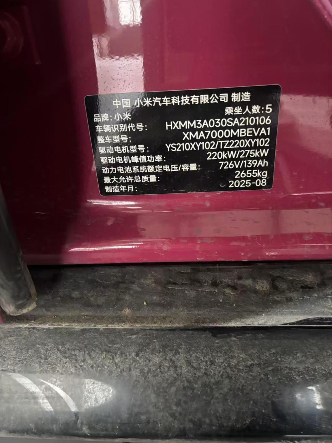 初次登记日期 2025-08-23 车辆名称 小米汽车