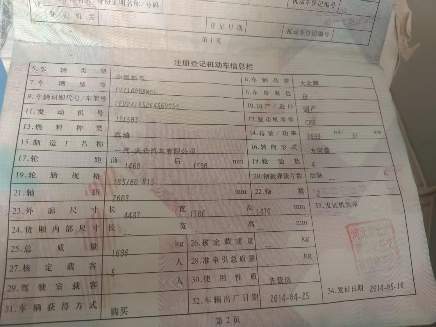 初次登记日期 2014-05-16 车辆名称 大众 捷达