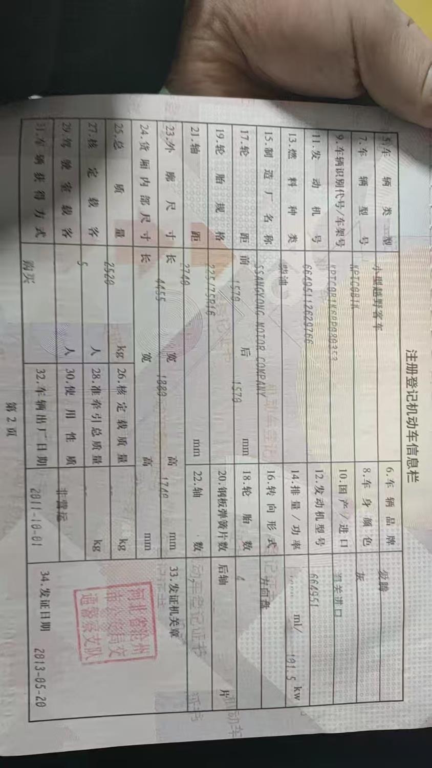 初次登记日期 2013-05-20 车辆名称 双龙 爱腾