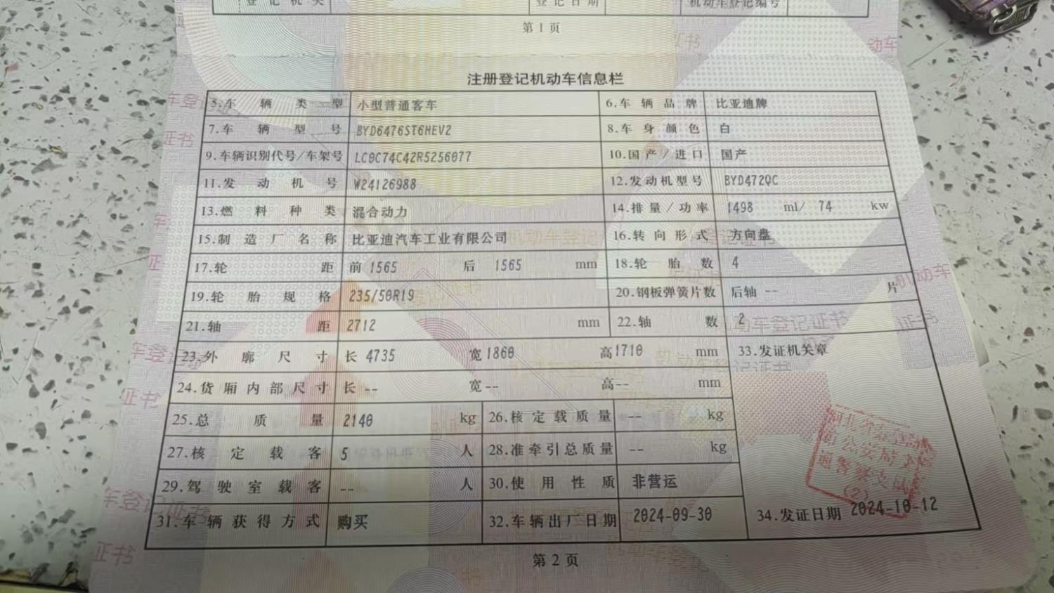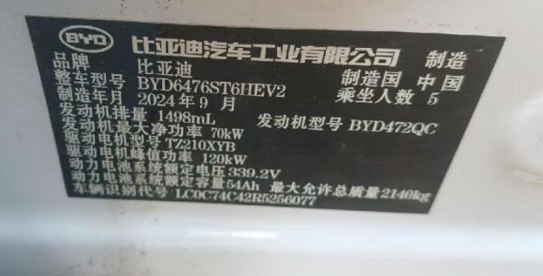 初次登记日期 2024-10-12 车辆名称 比亚迪 宋Pro