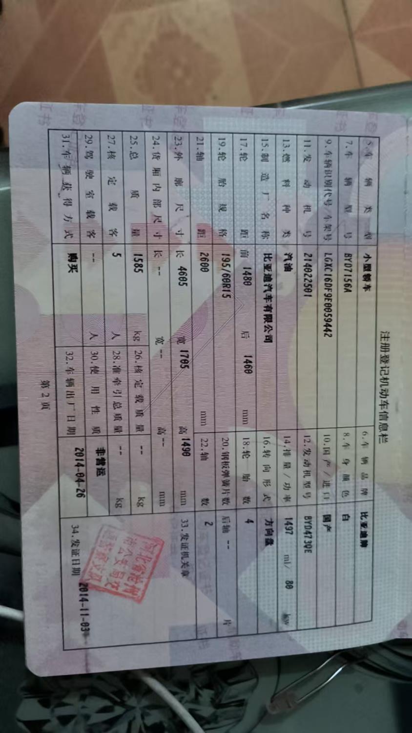 初次登记日期 2014-11-03 车辆名称 比亚迪F3