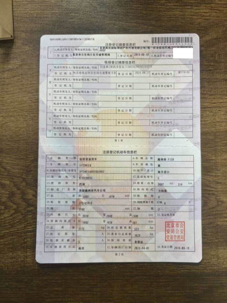初次登记日期 2019-09-18 车辆名称 福特F-150猛禽