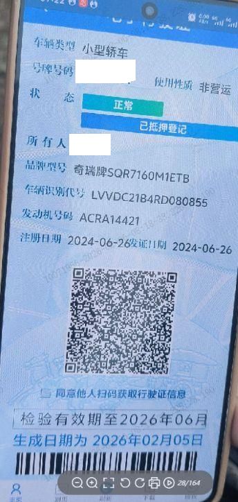 初次登记日期 2024-06-26 车辆名称 奇瑞 艾瑞泽8