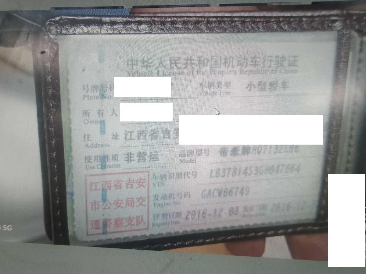 初次登记日期 2016-12-08 车辆名称 吉利汽车 帝豪GL