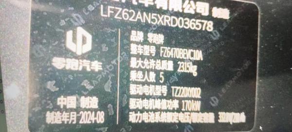 初次登记日期 2024-08-06 车辆名称 零跑汽车 零跑