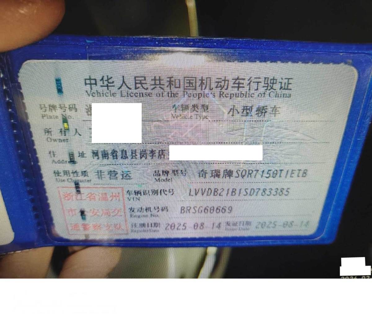 车牌号 浙****** 品牌 奇瑞