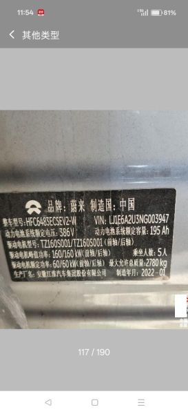 初次登记日期 2022-01-21 车辆名称 蔚来牌