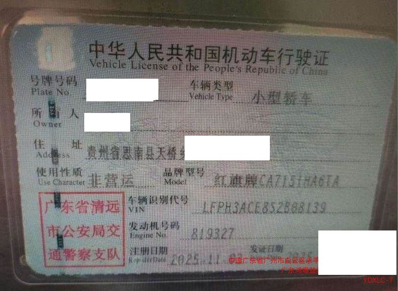 车辆归属地 广东省清远市 车辆停放仓库 广东省广州市广州市