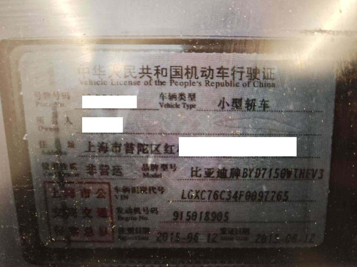 初次登记日期 2015-06-12 车辆名称 比亚迪 秦新能源
