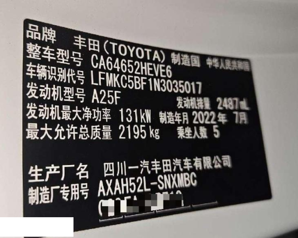 初次登记日期 2022-08-02 车辆名称 丰田 RAV4荣放
