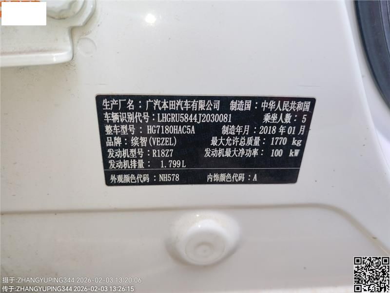 底盘号码 LHGRU5844J2030081 变速箱类型 自动